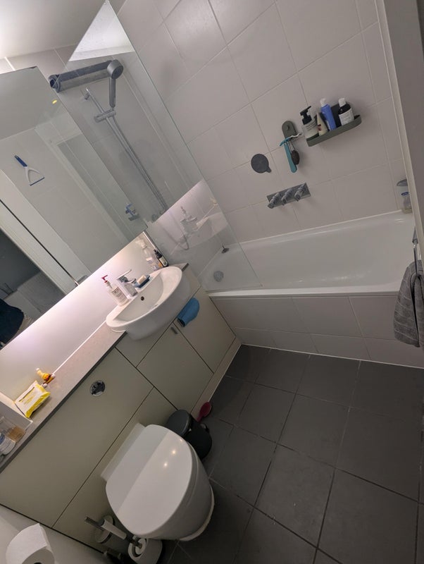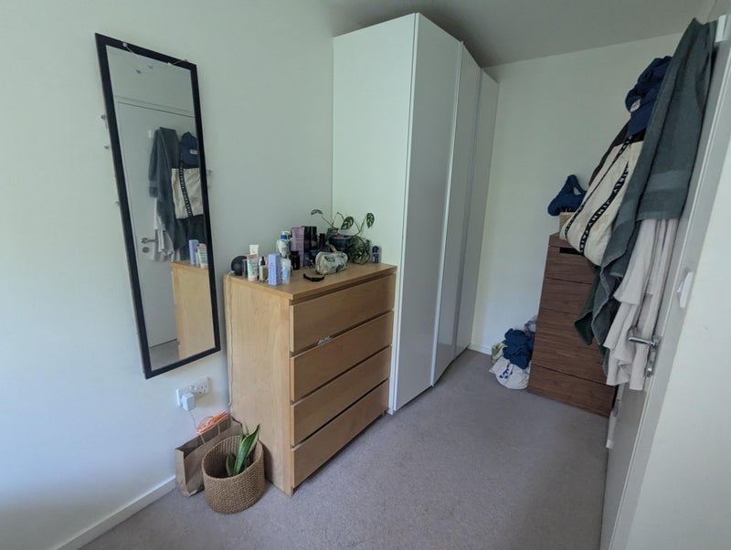 The room - a double room with a shared bathroom with one other girl, we both clean the bathroom regularly and keep towels/bath mats clean and the bathroom tidy for one another. The room has a 3-door huge wardrobe, a set of 5 smaller drawers (that come with the property) and a set of 3 larger drawers which I will leave (they were there before me) but you'd be under no obligation to keep them. Same with the mirror. I will be taking my black bedside table. There is a matching bedside table downstairs if you require it. You will also get a big cupboard for your things in the bathroom and in the kitchen plus a shelf in the pantry. Lots of storage!