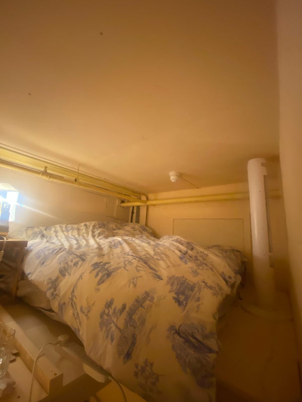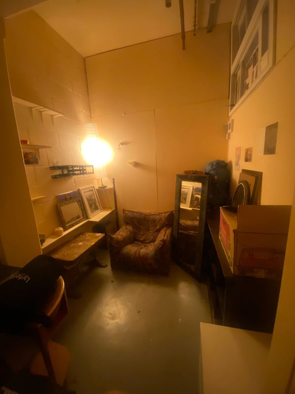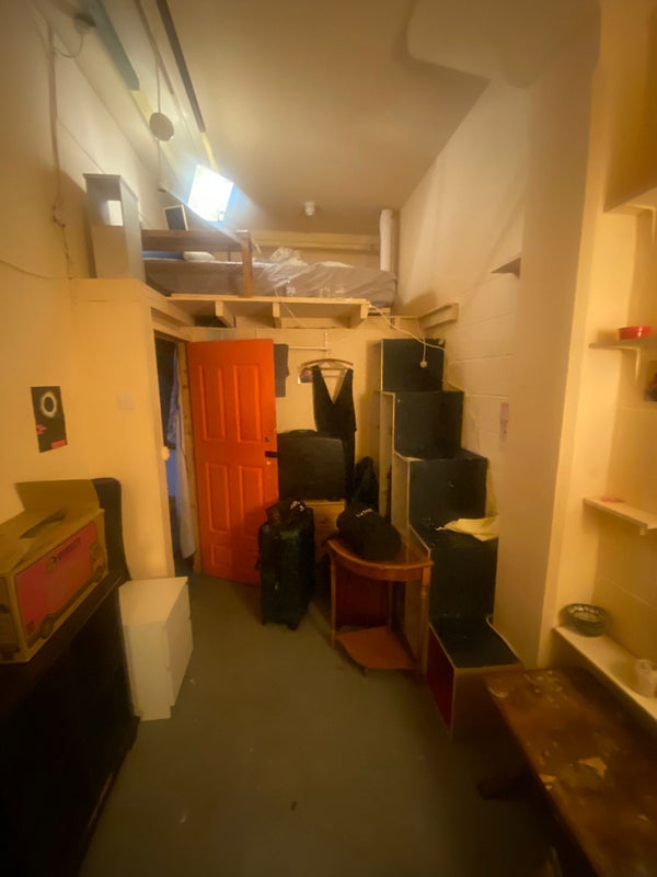 The available room is the one with red lighting (no red lighting inside there still anymore just normal lighting), has a mezzanine with a double bed on top and a staircase to get up to it and a sofa. Floor space is big enough for a desk etc. Red light can be changed ofc. Generally you can build/ paint/ change anything in your room as it’s a studio live in space.