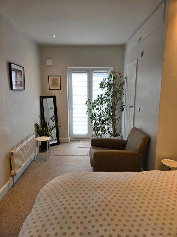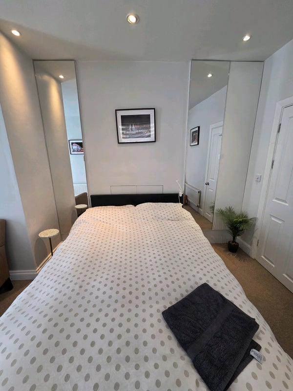 Comfortable and quiet double bedroom with UK size double bed, built-in storage.