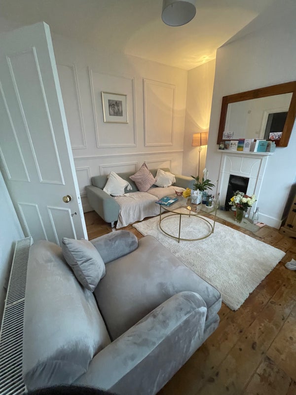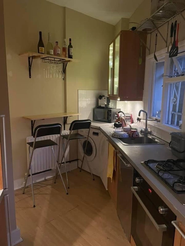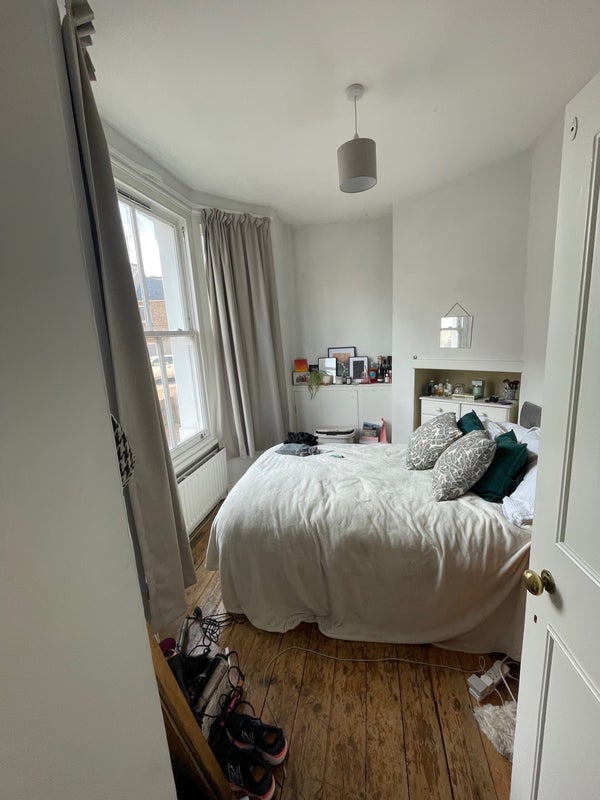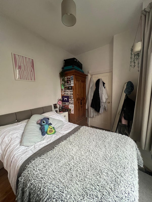 The room is cosy but light as it has a huge bay window. Includes a double bed, wardrobe, storage space. The flat has a back and front garden space, shared living room, bathroom and kitchen.