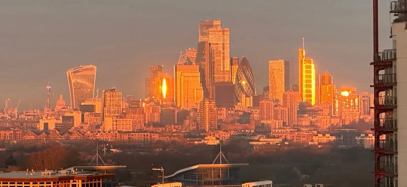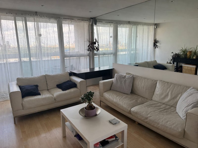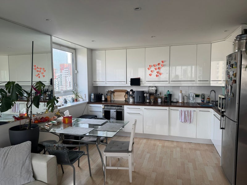 The flat has a spacious shared living room/kitchen, a large bathroom with a combined bathtub and shower, and a river-facing balcony with amazing views of the City of London from the 15th floor. There is also a large kitchen-side window with a great view of the Canary Wharf skyline.