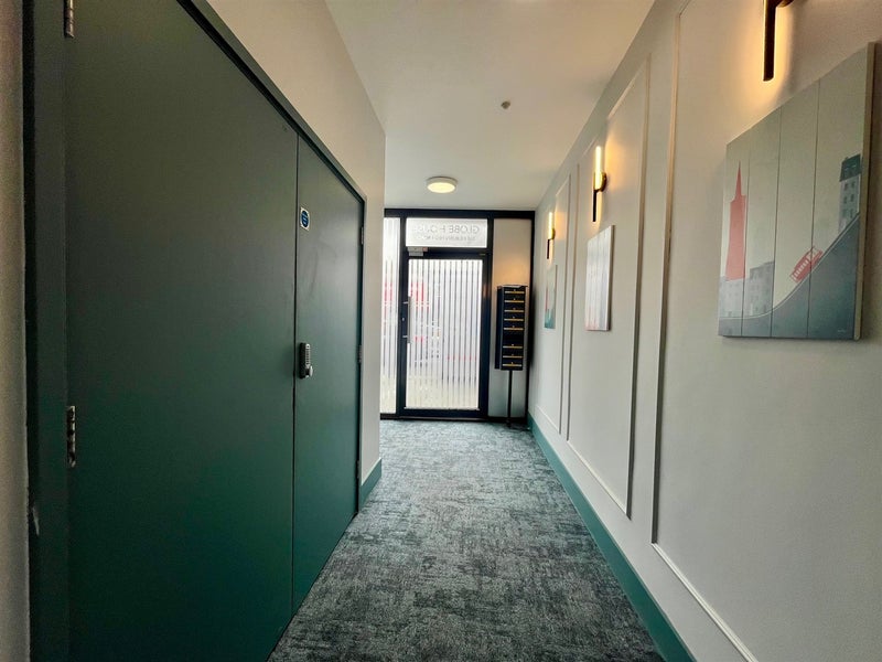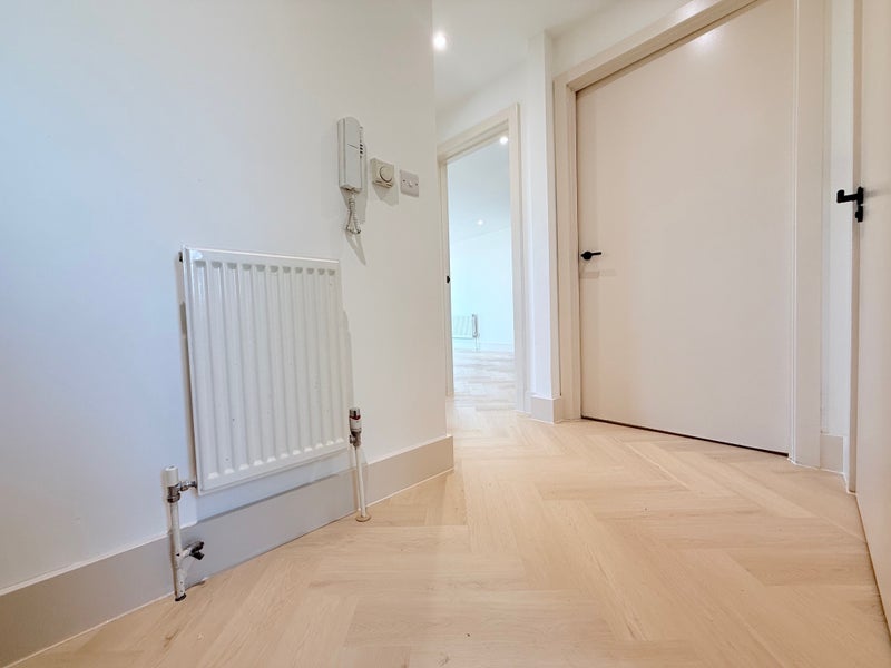 White painted walls, wood flooring, radiator, entry phone, spotlights, door to utility/fuse/storage cupboard (washing machine and fuse box inside)