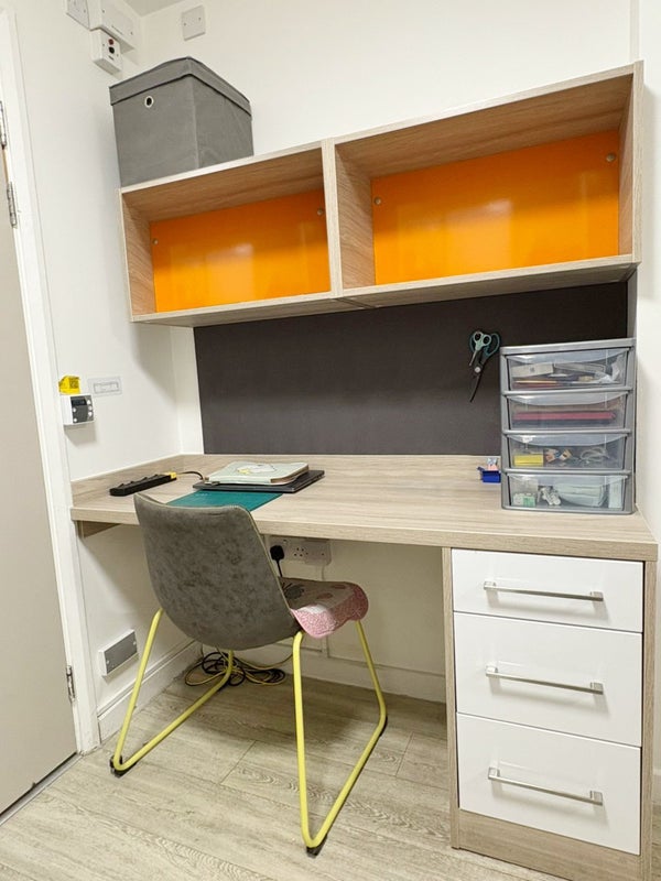 • Study area with chair, overhead shelving, side drawers and pin board