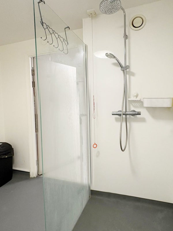 • Spacious accessible toilet with shower, WC, wash basin, toilet roll holder and bathroom mirror