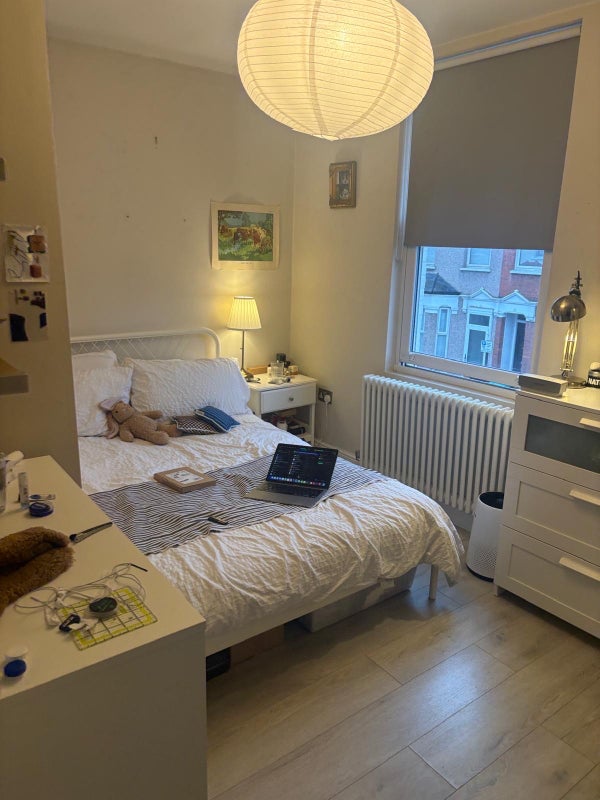 We have a spare room available in our three-bed flat. The flat has a fitted kitchen with dishwasher and washing machine, an open-plan living room, a good-sized bathroom with a bath, plus an additional upstairs loo. The room is furnished with a double bed, wardrobe, and chest of drawers.