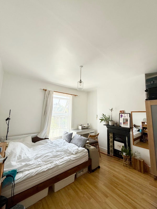 The room is big, furnished with double bed, drawers and a wardrobe. Facing garden so lots of light and quiet and peaceful at night.
