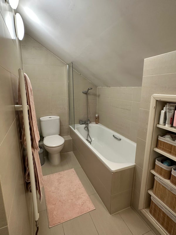 Upstairs, there are the two bedrooms and the two bathrooms. The flat has lots of storage space, dishwasher, washing machine / dryer.
