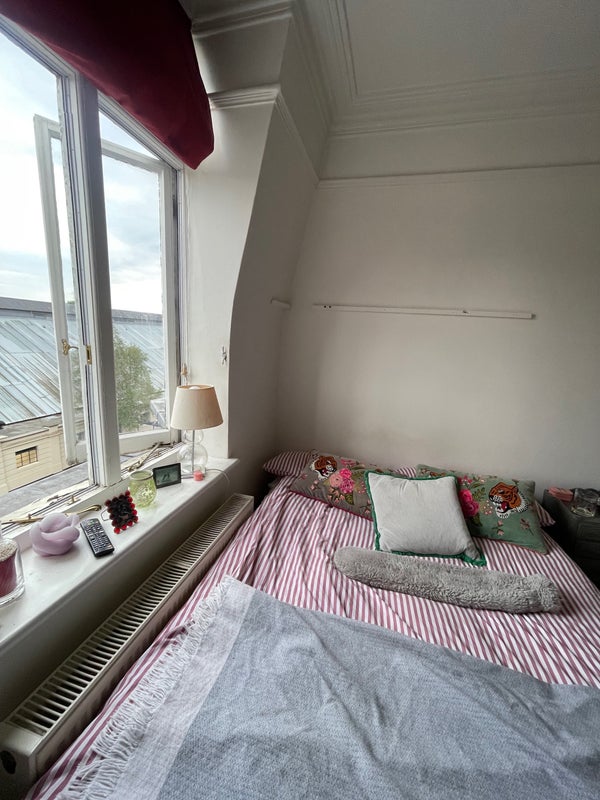 The room is compact but well laid out, with a comfortable double bed, high ceilings, and a large window that lets in plenty of natural light. It comes furnished with storage, shelving, and a wardrobe, making great use of the space.