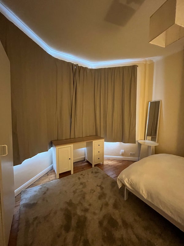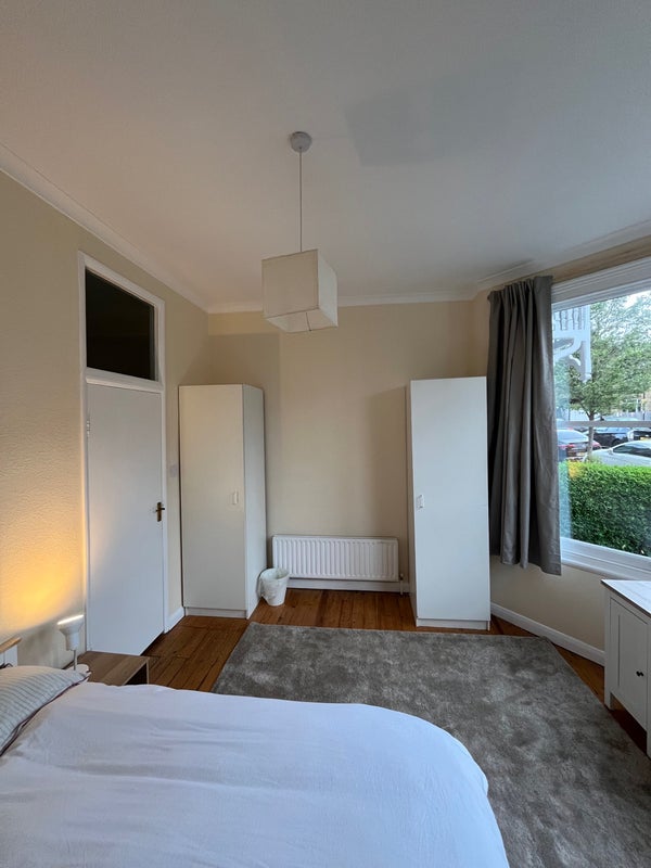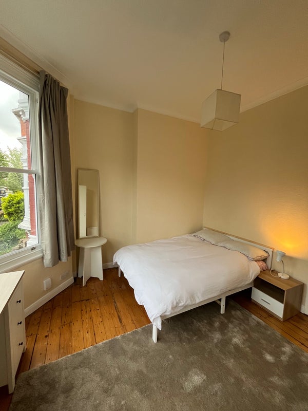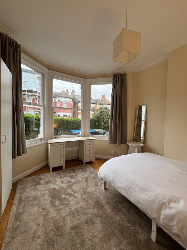 The room has large bay windows, and has been newly furnished (desk, double bed, rug, chair, 2 x wardrobes, bedside table, mirror, bin). A chair is missing from the photos, but it’s being delivered this weekend!