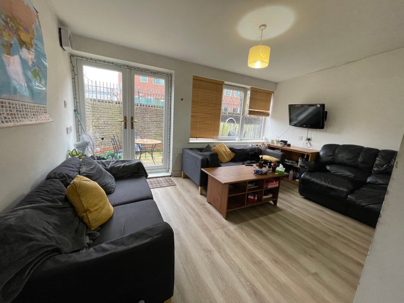 The living room is spacious and includes: a sofa and a coffee table. There are also a set of French doors leading to the patio/garden area, perfect for summer time!