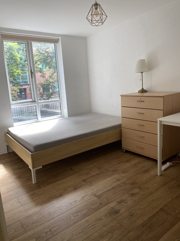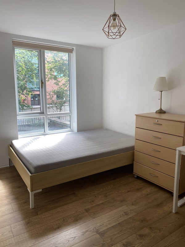 The room is bright, it has wooden flooring ; has a wardrobe, chest of drawers, a double bed and mattress.