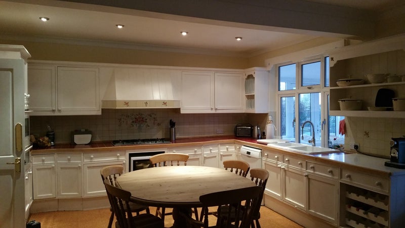 Downstairs is the enormous kitchen with dishwasher, 6 burner professional gas hob, double electric oven, combination microwave oven, table seating six- eight, large double sink, and a 2 seater leather sofa for those cosy chats whilst cooking