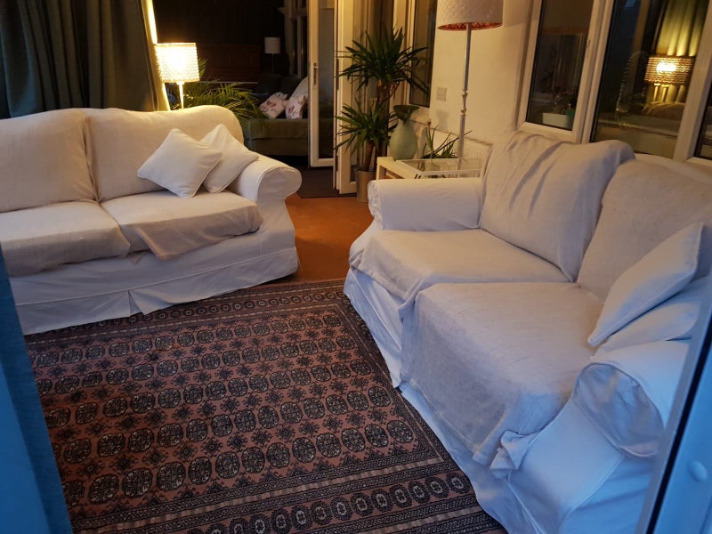 Huge lounge backing onto the rear garden with 2 sofas and 3 armchairs and a smart tv.