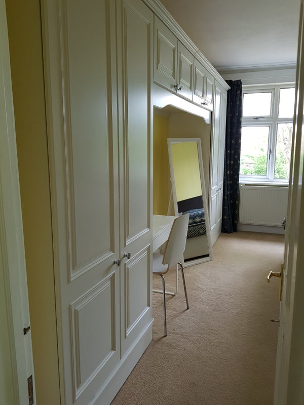 The room has a built in sink/vanity unit tucked away in a cupboard and many fitted wardrobes, cupboards, a desk and chair.