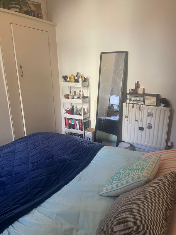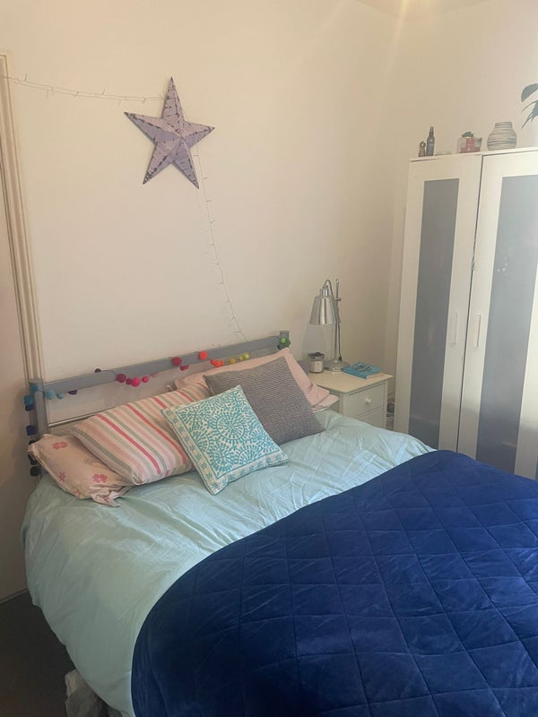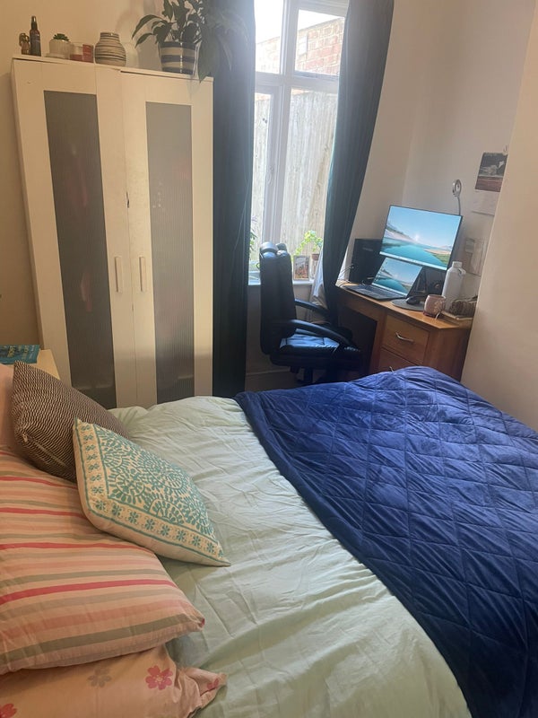 The available room is on the ground floor and comes furnished with a double bed, built-in shelves, and a freestanding wardrobe. There’s also space in the corner for a desk and chair, which is ideal for those who work from home.