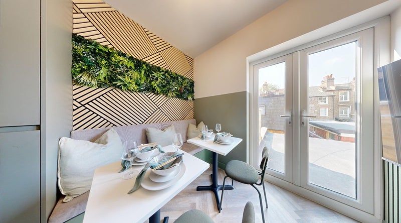 A Café style dining area for eating individually or communally as a house. The space doubles up as Co-Working Space during the day with sockets and phone charging points conveniently located if you want to escape your room and work from home in a more social setting.