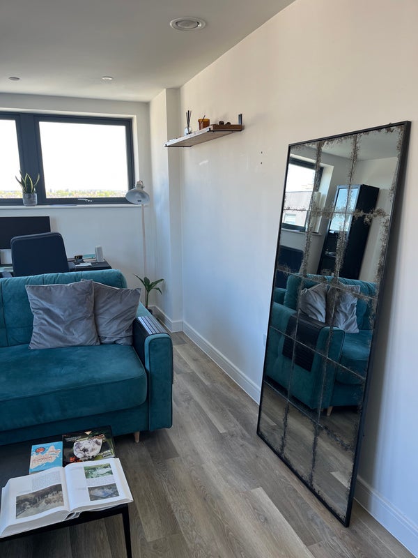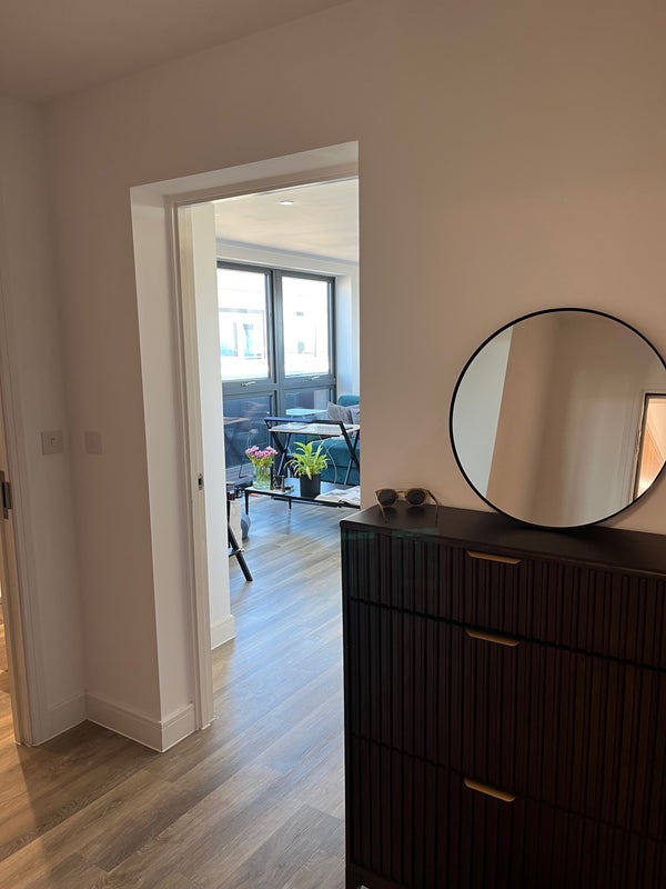 This is a top floor penthouse in a new building with panoramic windows and a balcony with Thames river view.