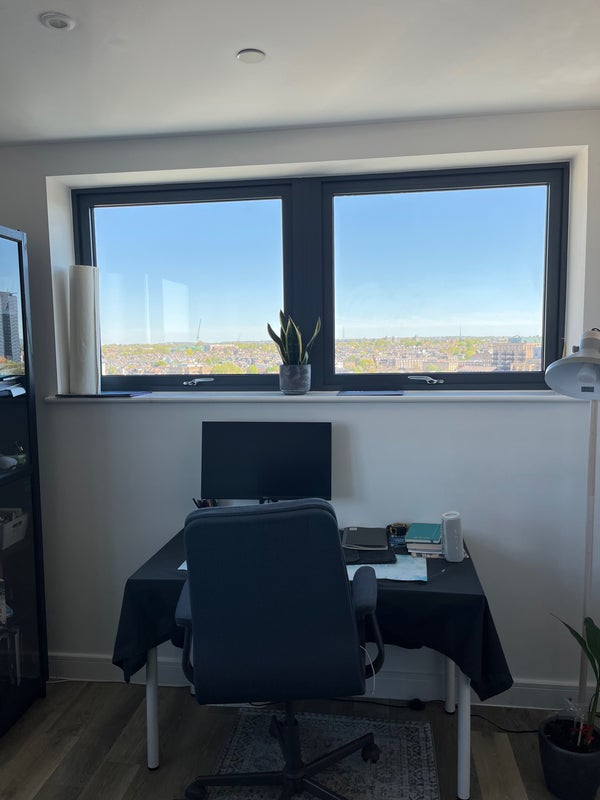 Open plan living room with a kitchen, very comfortable sofa, and a work desk with a second screen.