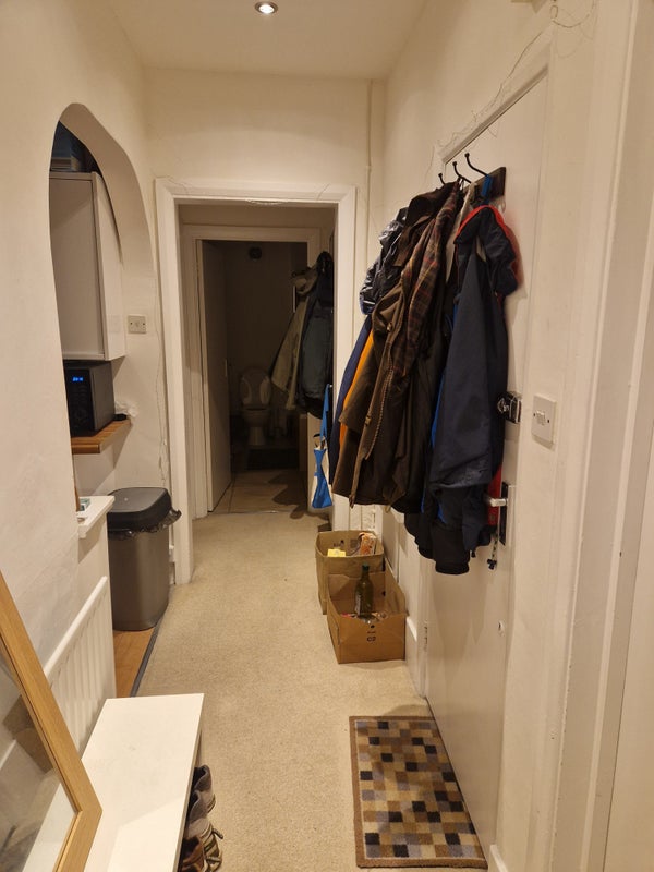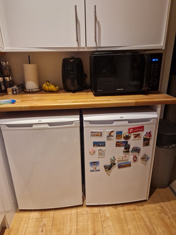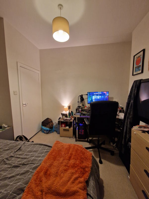Everything shown in the bedroom is included except for the posters, the desk and the chair. All appliances in the kitchen are also included and have been working fine. Left appliance is the freezer with 4 drawers, and right is a fridge with 4 shelves and a crisper. The washer is a washer dryer. Everything in the living room will also be there apart from the hung up posters. The corridor photo is taken from where your room would be, with my room being next to the bathroom so there's a good degree of separation.