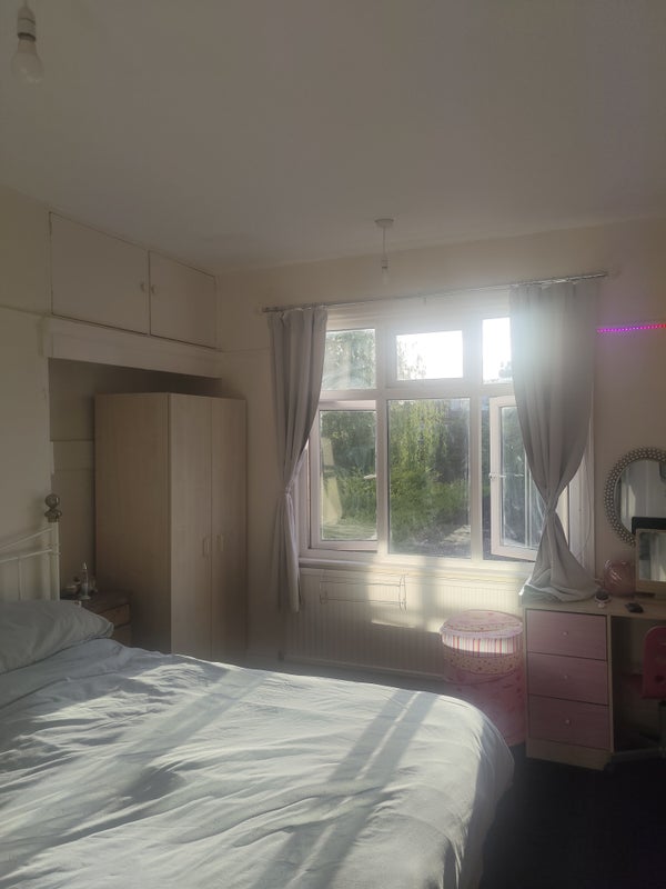 A spacious double room is available in a serene family home. With my daughter away for a year or more, her room is now open for grabs. We are seeking a clean, responsible, and trustworthy female. You will be sharing the house with myself and my son (21). Occasionally, my daughter may return for a weekend stay, during which she will use the spare box room.