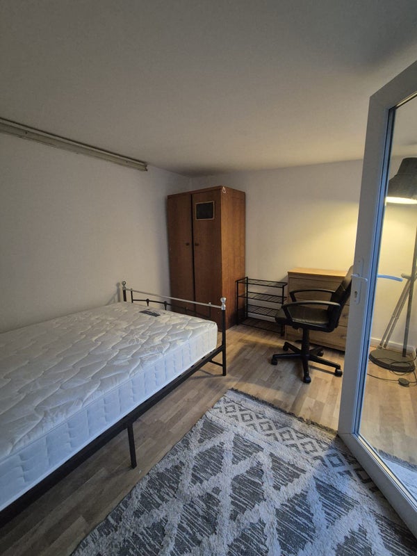 Room includes bed a wardrobe, desk chair and floor lamp. Space for your own desk is available for working from home.