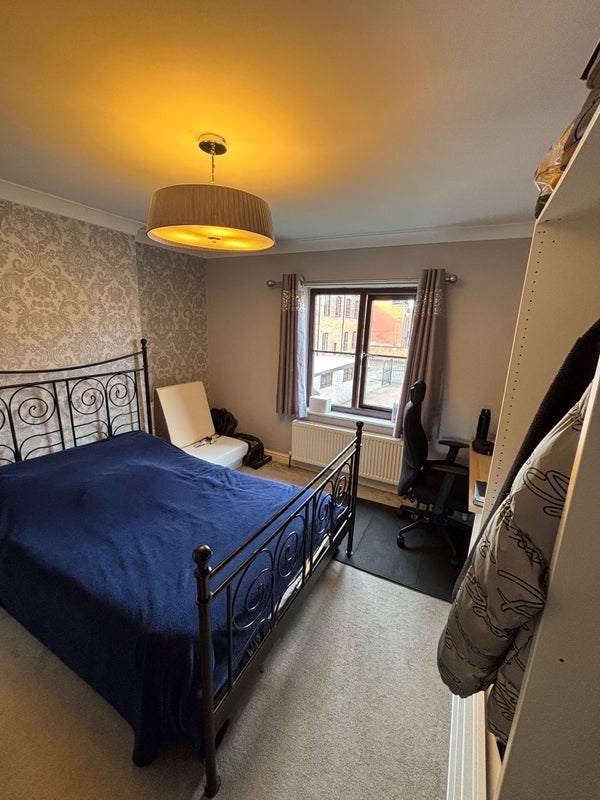 This spacious double room offers comfortable, furnished accommodation ideal for professionals and students seeking quality shared living. The room features a generous double bed, mirrored sliding-door wardrobe with ample storage, dedicated desk and chair, radiator, and a double glazed window providing excellent natural light. Freshly carpeted throughout for comfort and cleanliness.
