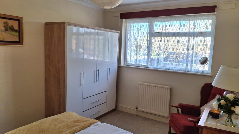 Your large double room is bright and elegant, measuring 3.6m x 3m, with views of gardens and a field. There's loads of storage space, including a built in cupboard and new triple wardrobe. New mattress and memory foam topper.