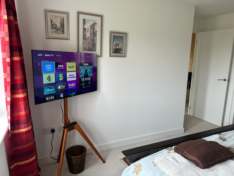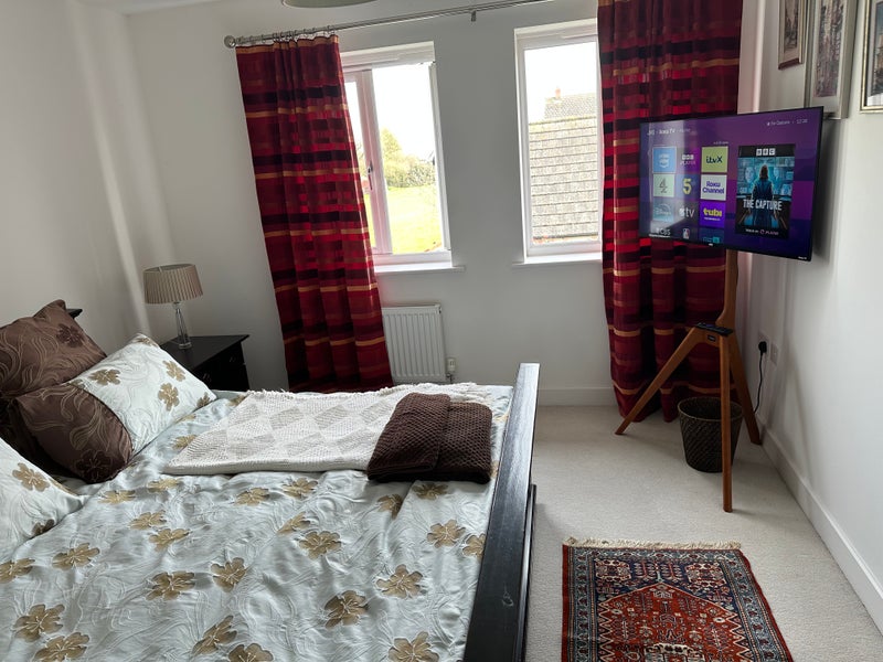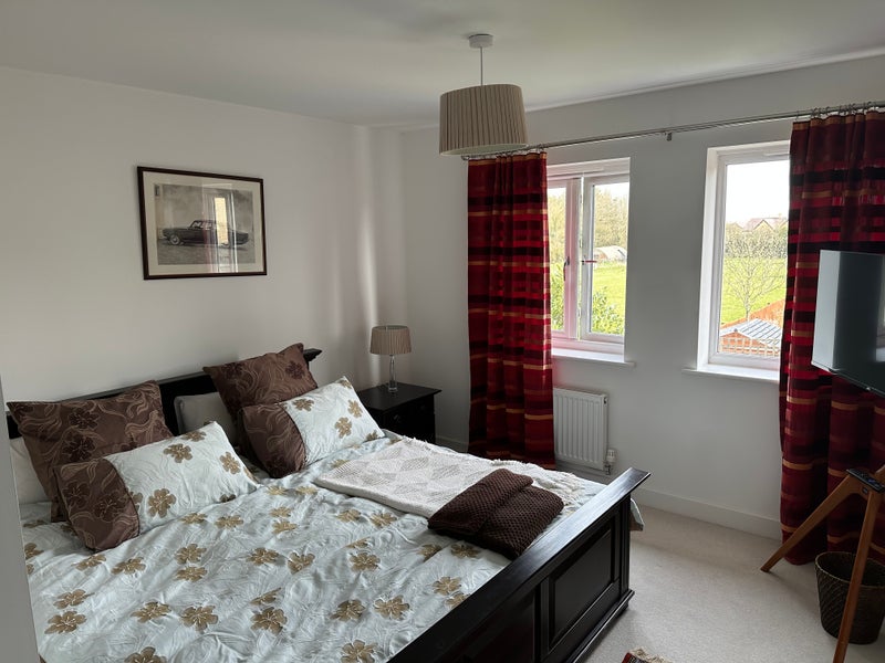 Furnished double bedroom including Kingsize bed TV and private bathroom with power shower.