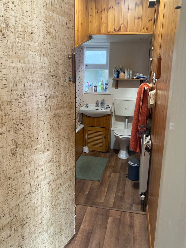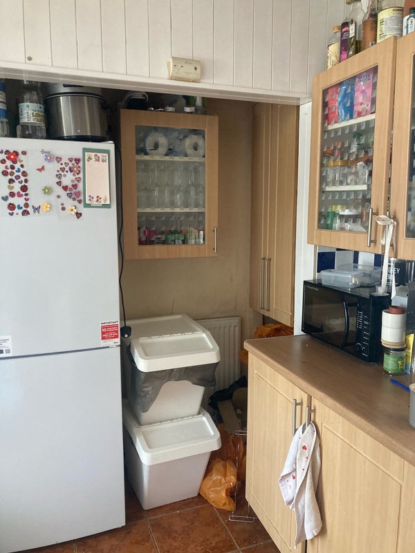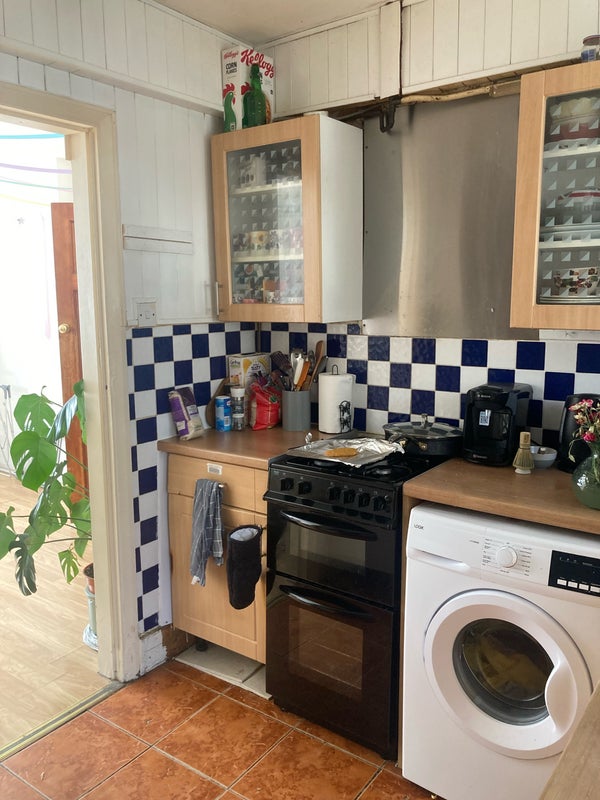 The room has a (small) double bed and storage inside and outside the room. The kitchen is stocked with a microwave, gas oven and hob, plenty of cupboard space, and a large fridge freezer.
