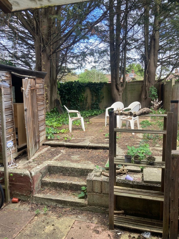 There is a large communal living room space and a private garden including a shed.