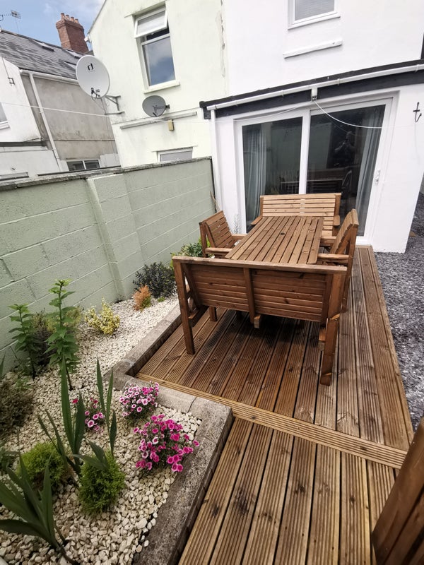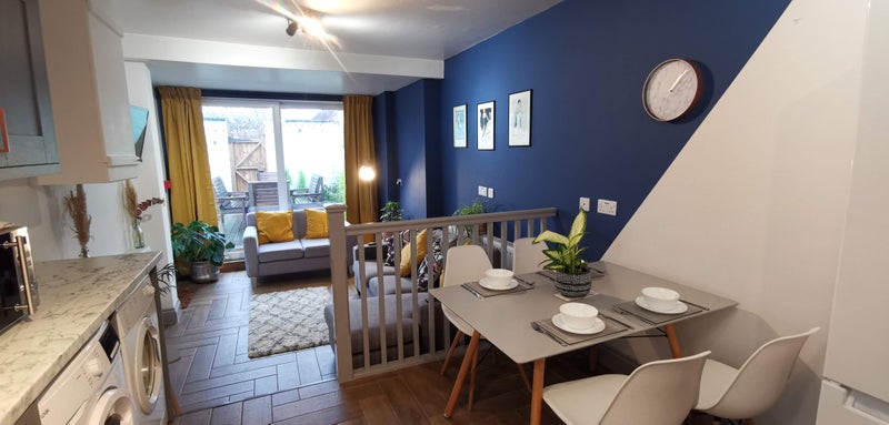 30sqm shared open plan kitchen/ dining/ living space with patio doors leading on to a sun trap of a garden with Decking, bespoke wooden garden furniture and rear access.