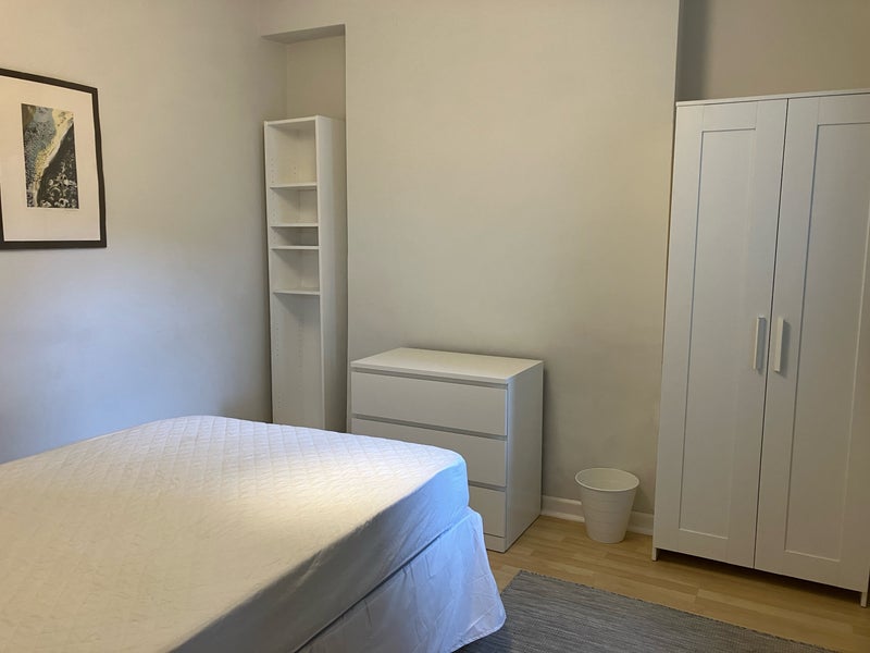 The pleasant double room has a double bed, chest of drawers, bookshelf and a wardrobe