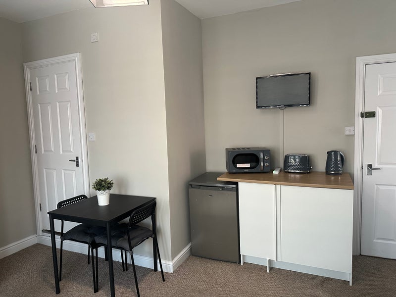 The studios are en-suites they come with a double bed, flat screen TV, a build in wardrobe, a mini kitchenette, a dining table with two chairs, a single seat sofa and a bedside table.