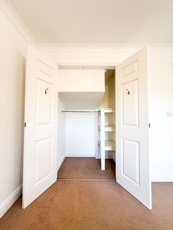 Room 2: A very large double bedroom with a private bathroom (not en-suite), ottoman bed, mattress, and built-in wardrobe.