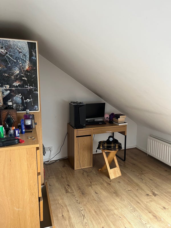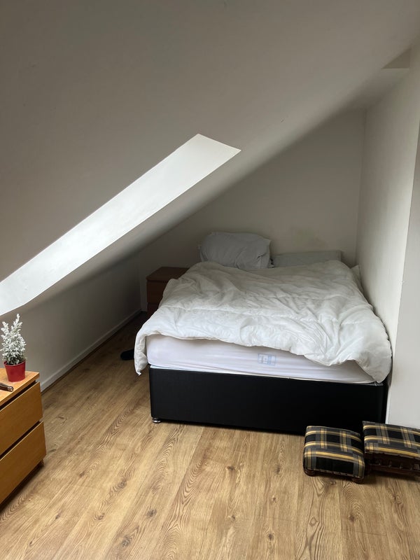 The room is an attic, up two flights of stairs. There is a shared living room, kitchen, and two bathrooms.