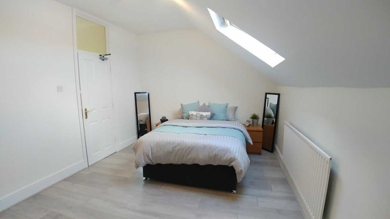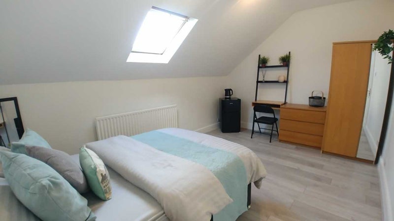 Lovely large, modern top floor room, with double bed, ladder desk, fridge/freezer & kettle.