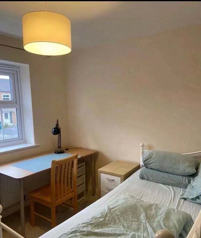 Inside the en-suite room: Single Bed, Desk, Chair, and Wardrobe.
