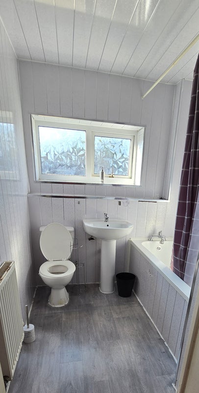 - Bathroom This house has a bathroom with toilet, bath and basin.