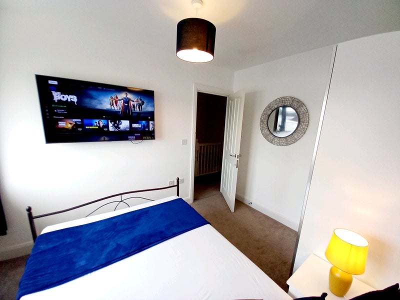 -A bright and newly furnished double bedroom with wall mounted 50 inch HD smart TV, Netflix & Amazon prime accounts included.
