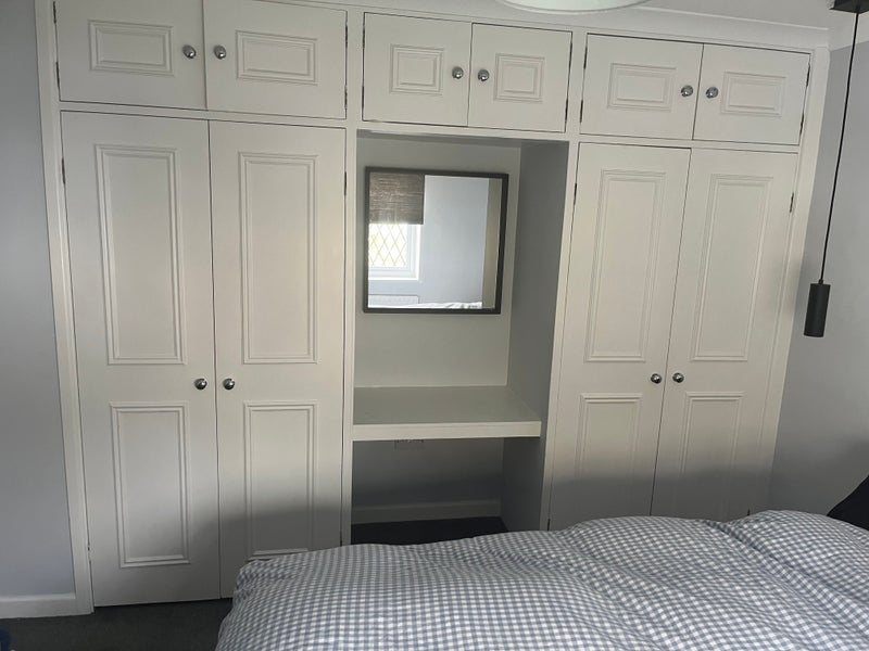 The room has a double bed and plenty of storage.