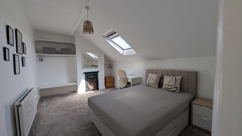 It's a bright airy freshly painted.. Comfortable double divan base and brand new habitat memory foam mattress. Lots of hanging space & shelving and desk & chair