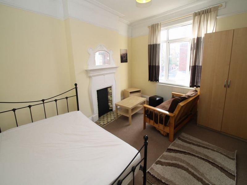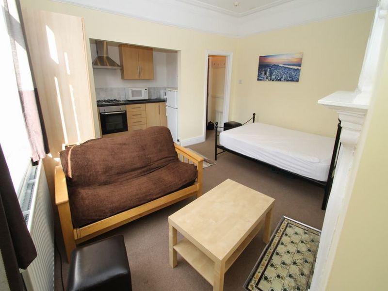 Large bedsitting room with period fireplace, recently refurbished. Separate kitchen alcove with own kitchen. Fully furnished.