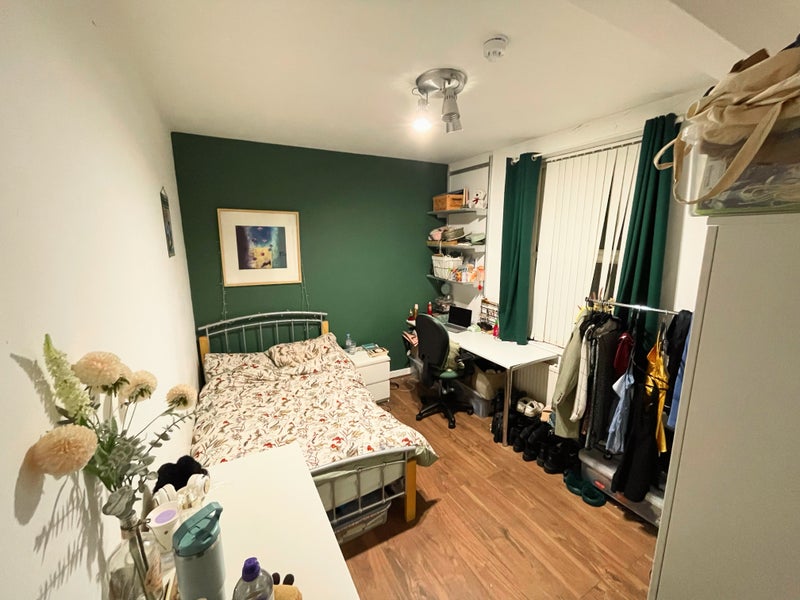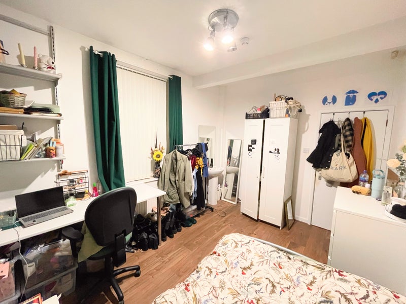 The room is beautifully decorated with a green statement wall. It comes with a double frame bed and mattress, wardrobe, chest of drawers, bed side table drawers, built in desk and shelves and black out curtains. The room also has its own sink. Current photos are the current tenants photos, so it is a true representation of the room as it is now.