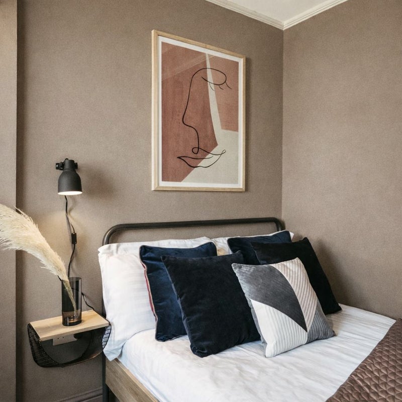 Bright, modern double bedroom with wardrobe, drawers, bedside table, desk & chair, shelves, and under-bed storage. Comfortable bed for a great night’s sleep. Shares a modern bathroom with one other tenant. £300 deposit + rental guarantor required.