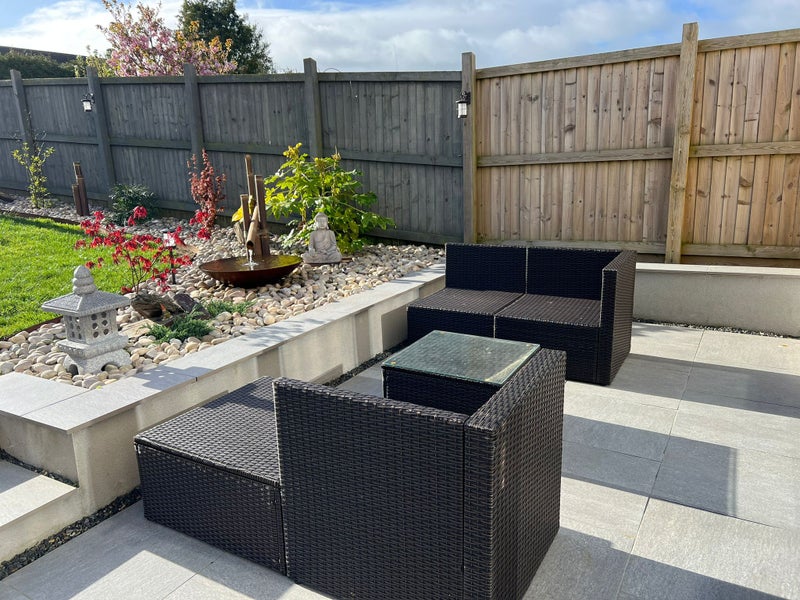 The kitchen is fully equipped with a double oven, five-ring induction hob, microwave, dishwasher, large fridge, large freezer, and instant boiling hot water tap. Outside, there is a garden with a patio area for sitting out, and off-street parking is available.