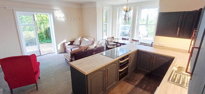 Light dual aspect kitchen, dining, living room with doors leading out to large garden.