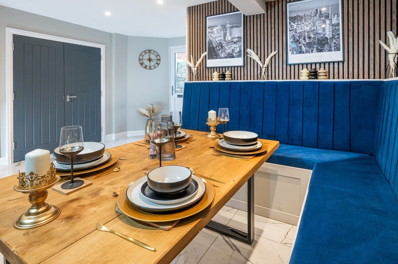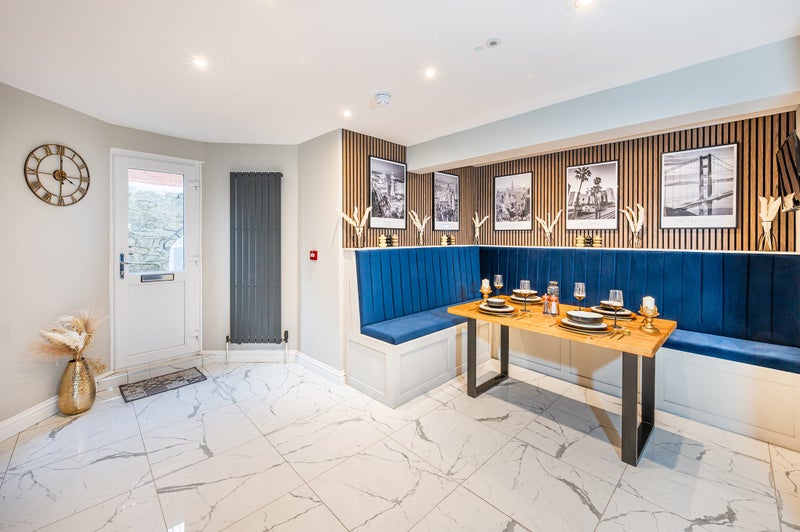 The house has amazing, shared facilities, The communal area has a bespoke upholstered seating bench in a stunning midnight navy. There is then a cut to size dining table in industrial wood. This area is perfect for eating meals and unwinding or can be used for work. There is a 32" Smart Tv also.