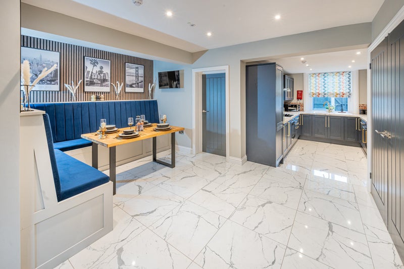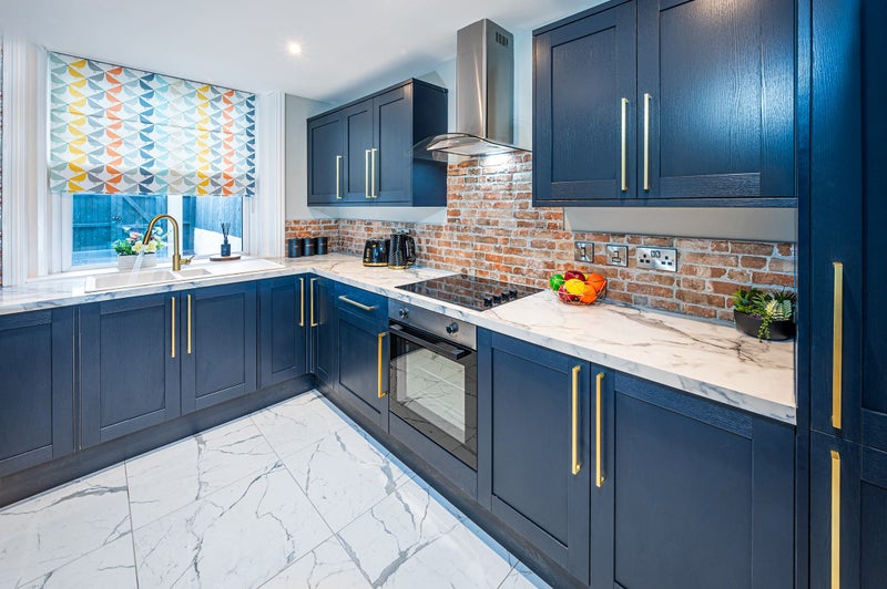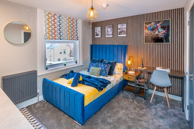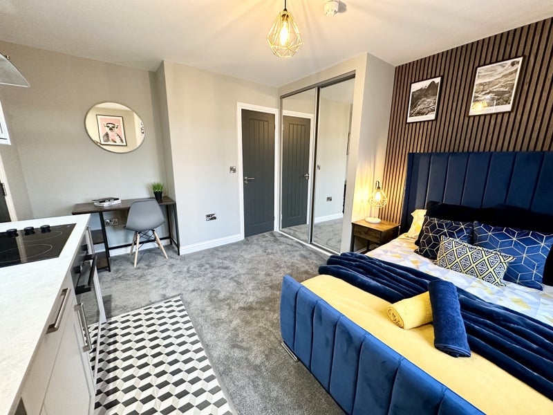 The room has plenty of light in the day and is a cosy bedroom when the bespoke black out blind is drawn. There is a large, upholstered midnight navy double bed with bedside table and caged industrial style lamp. The room will come with the bed and mattress however bedding is not provided. The rooms are dressed for illustrative purposes only. The 32” Smart TV is located within the kitchen.