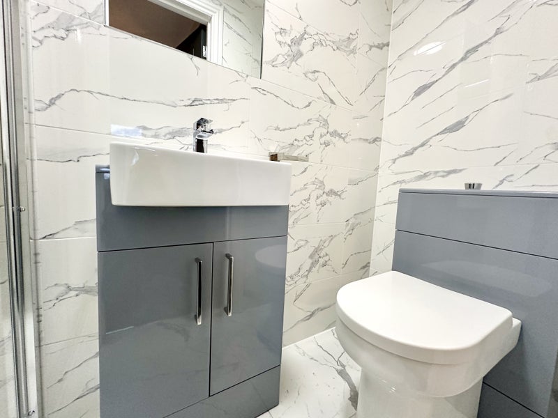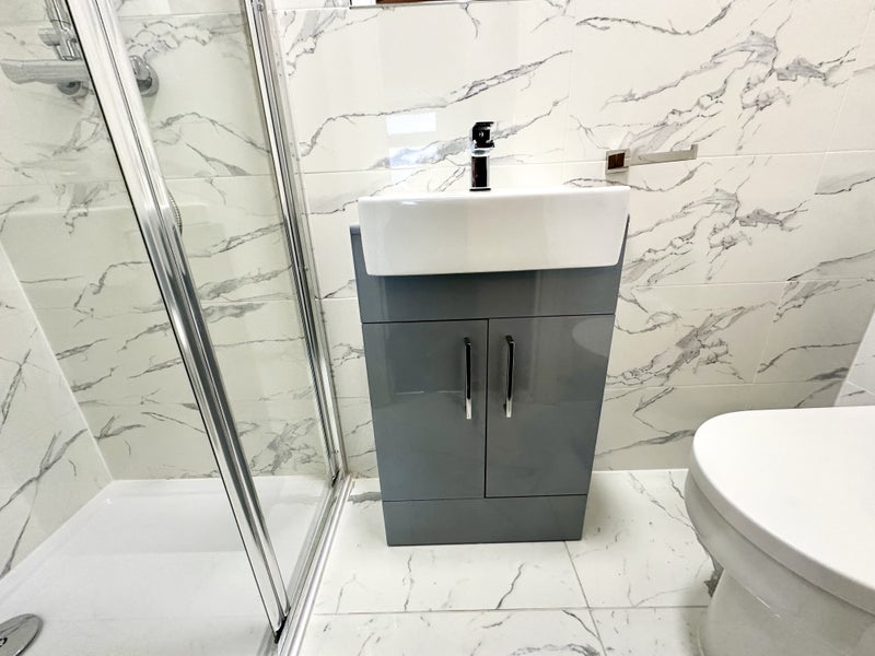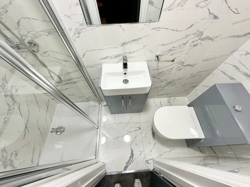 WOW, the en-suite must be the best part. This floor to ceiling marble tiled bathroom is one of a kind. There is a built-in mirror with glass grey vanity unit, perfect for storage. The shower is a walk-in shower with huge shower tray. so much room. There is a rainfall shower head and detachable hose.
