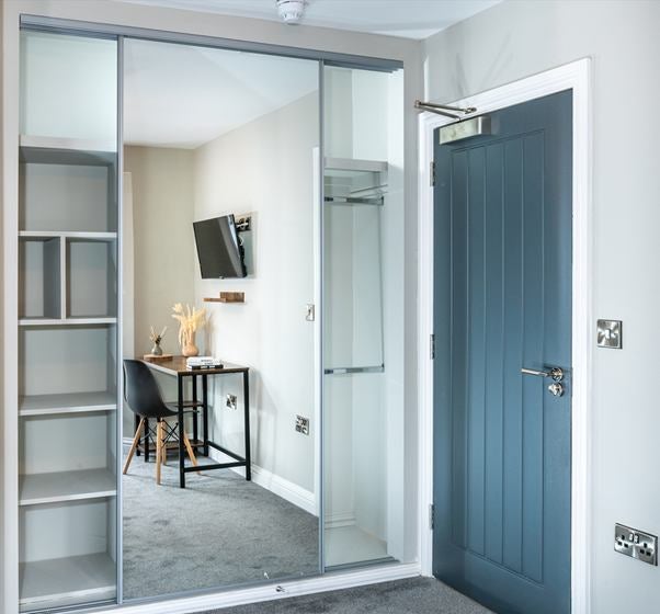 The studio offers a huge amount of storage with a bespoke built in wardrobe. The wardrobe has a large mirror sliding door which open to one side of bespoke compartments perfect for folded clothes. The other side offers two rails and floor space for shoes. There is also a large amount of space perfect for suitcases at the top of the wardrobe.
